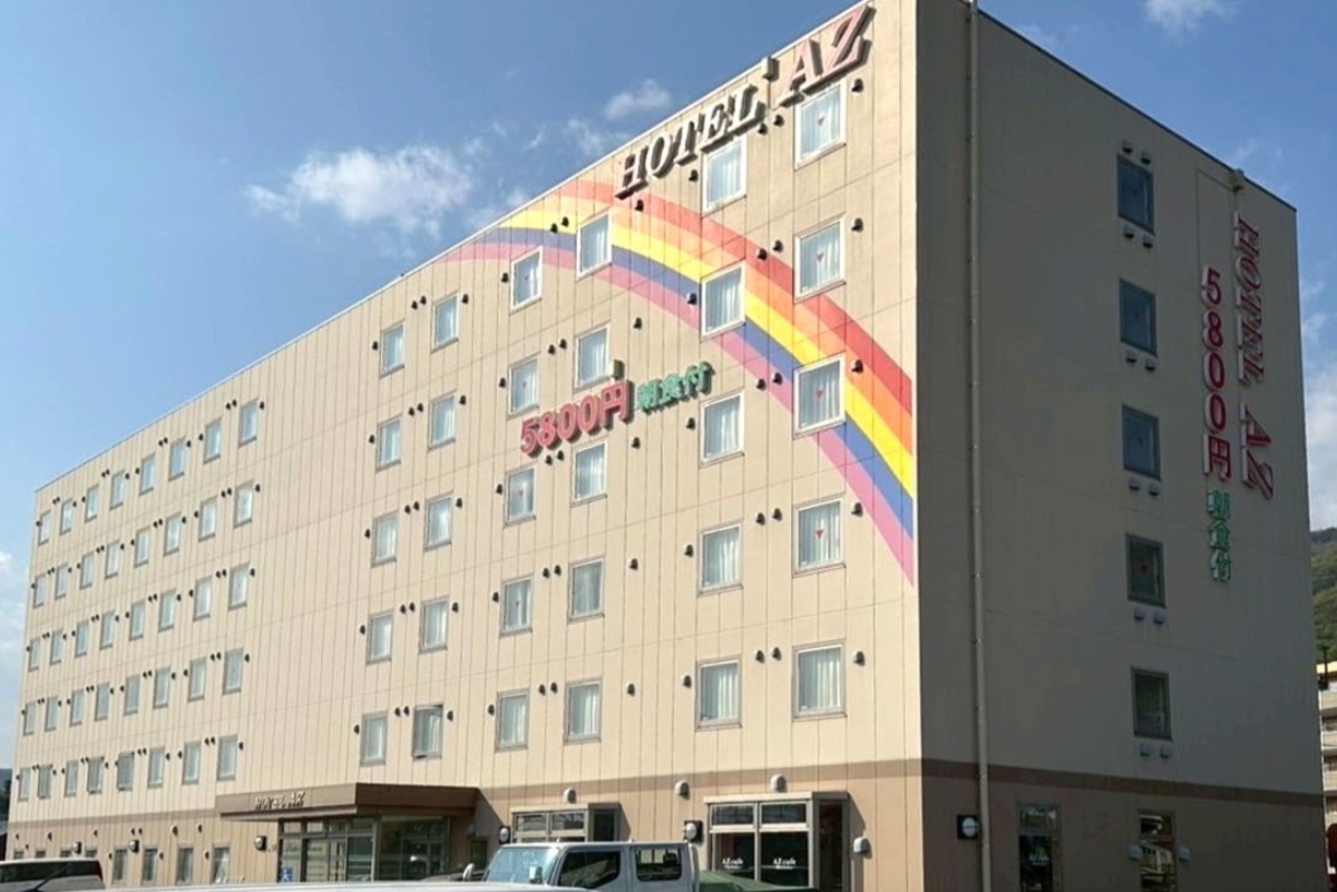 外壁に掲げられた大きな虹のマークでおなじみのHOTEL AZ。