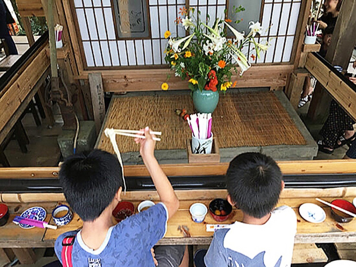 加茂川のせせらぎや緑あふれる木々の中で楽しむそうめん流しは、夏の思い出づくりにぴったり。