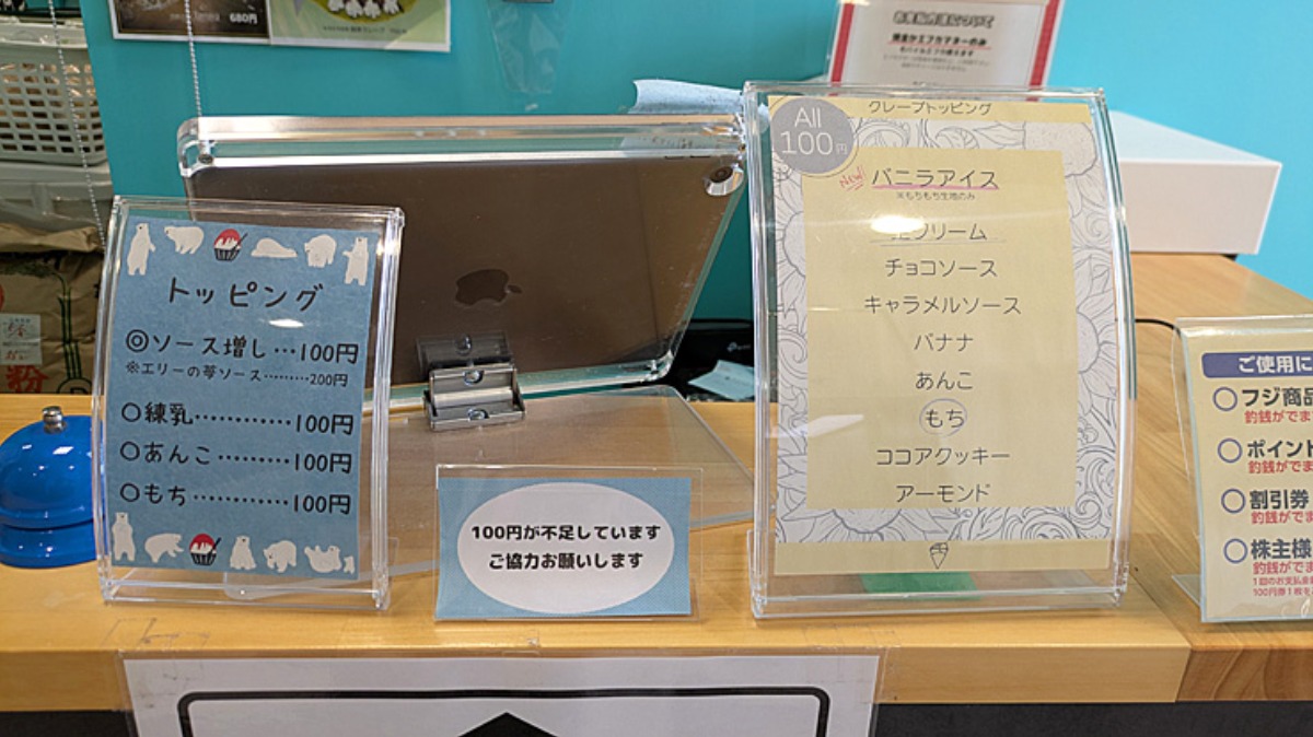 かき氷やクレープにはトッピングもできます。おもちとかのトッピングも美味しそう。