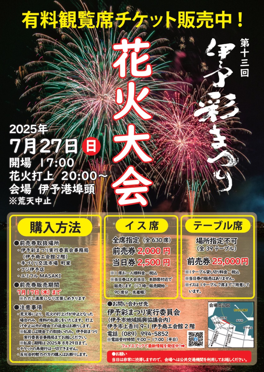 また、花火大会の有料席はエミフルMASAKI、フジ伊予店、手作り交流市場町家、伊予市観光物産協会ソレイヨで7月17日(木)まで販売されており、前売り券は売り切れ次第終了なので早めの購入がおすすめです。