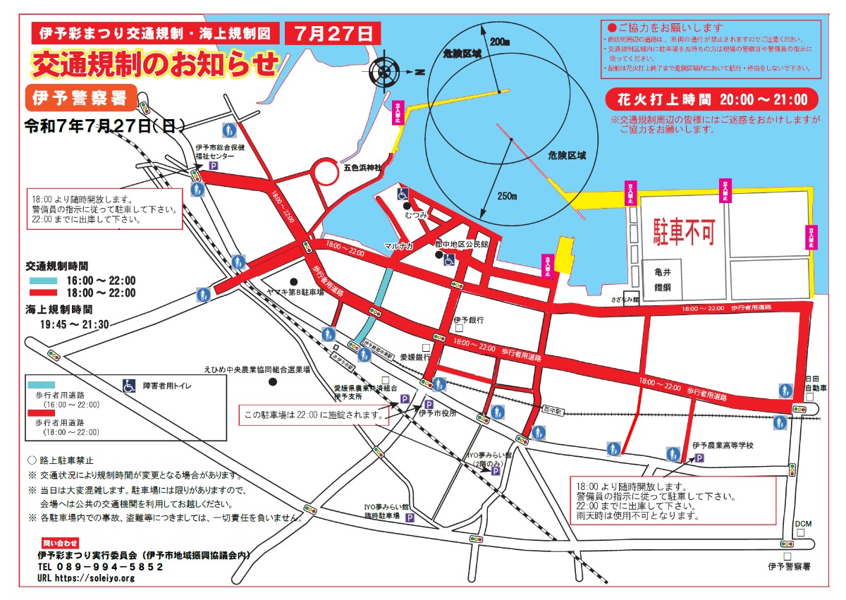 会場の伊予港埠頭・灘町商店街周辺は、イベント実施中広範囲で交通規制が行われます。