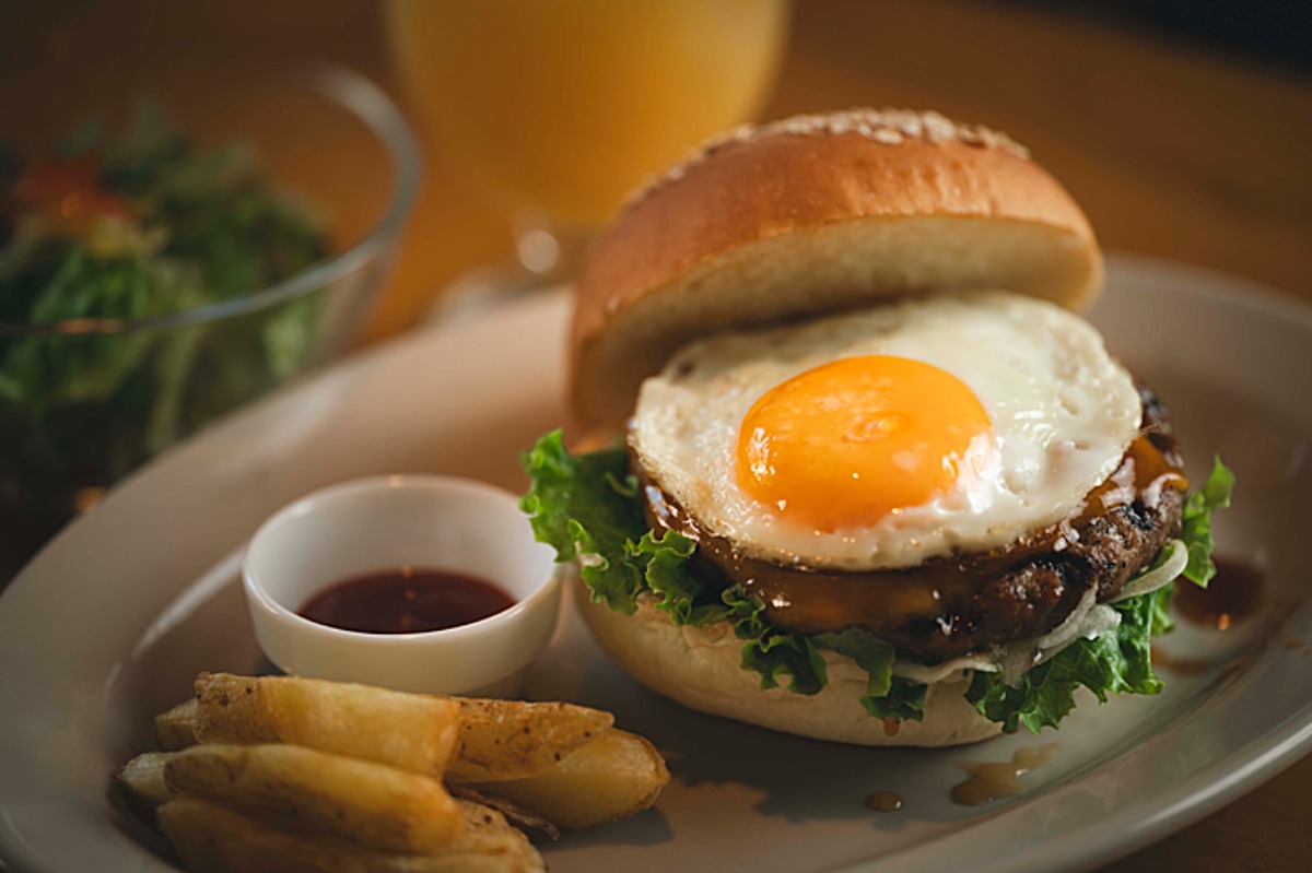 国産牛・豚合挽きで作るパティや目玉焼きなどを自家製のバンズでサンド。