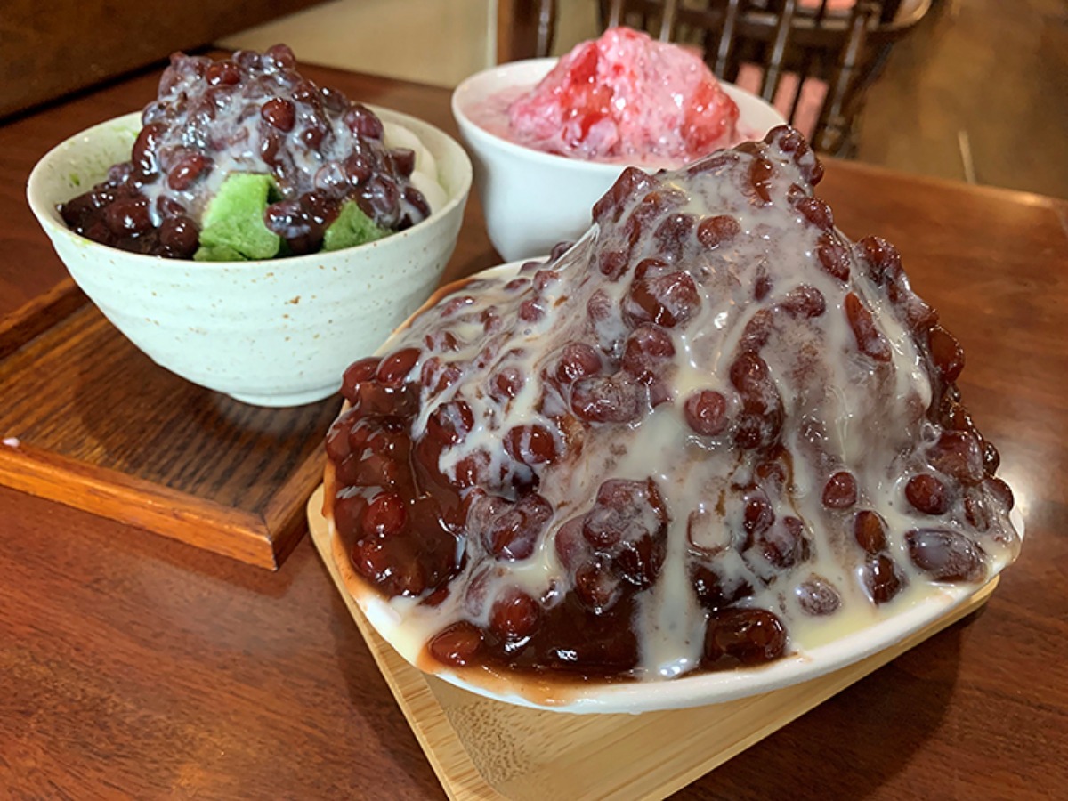 大きな小豆の粒が壊れないように、2日間かけてふっくら煮込み、夏季には「氷ぜんざい」として“かき氷“で登場します。