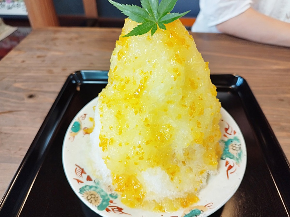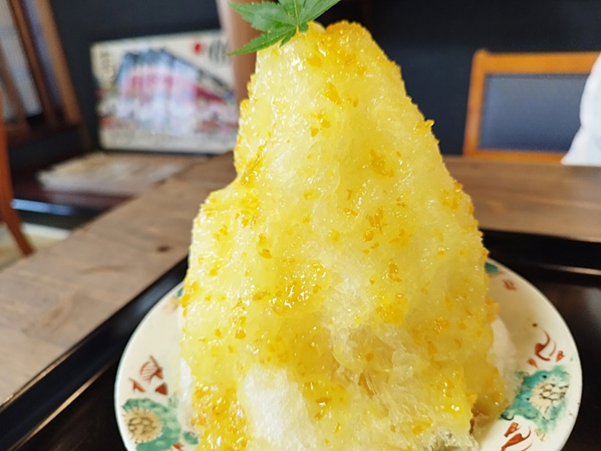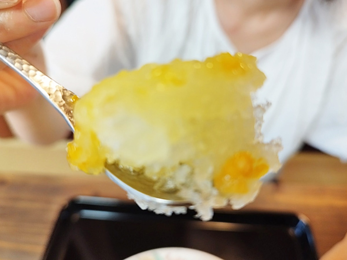 いよいよ待ち侘びたかき氷との邂逅。まず運ばれてきたのはかき氷メニューの中では珍しい?「ゆず」のかき氷850円。テーブルに置かれた瞬間からゆずの香りがいっぱいに広がるほどゆずの皮がふんだんに散りばめられていて、さっぱりした味わい。食後にもペロリと食べられそうです。甘すぎず、スッキリとしたかき氷なので甘すぎるのは苦手という人でも安心です。