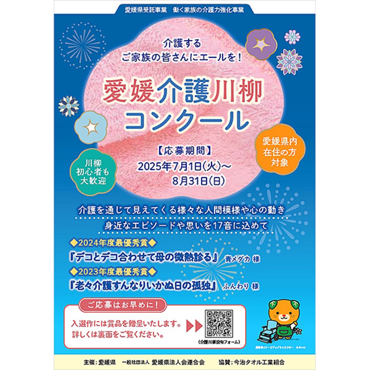 「介護」をテーマとした川柳を募集しています。介護を通じて見えてくるさまざまな人間模様や思いなどを、五・七・五の17音に込めてみませんか? 入選作にはギフトカードと今治タオルセットを贈呈します。詳細は愛媛県法人会連合会のHPをご確認ください。