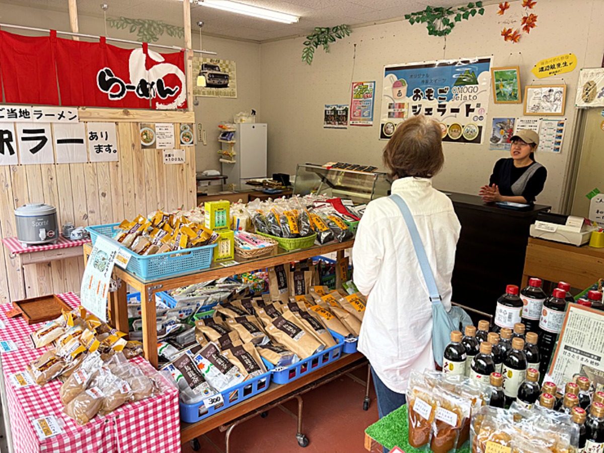 店内は、久万高原町の特産品がたくさん!自家製こんにゃくや烏龍茶、味噌やお醤油など、