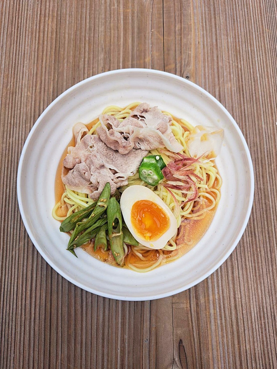 豚冷しゃぶに煮卵、面河のイタドリと久万高原町育ちのオクラとみょうがもトッピング。季節の野菜が楽しめます。