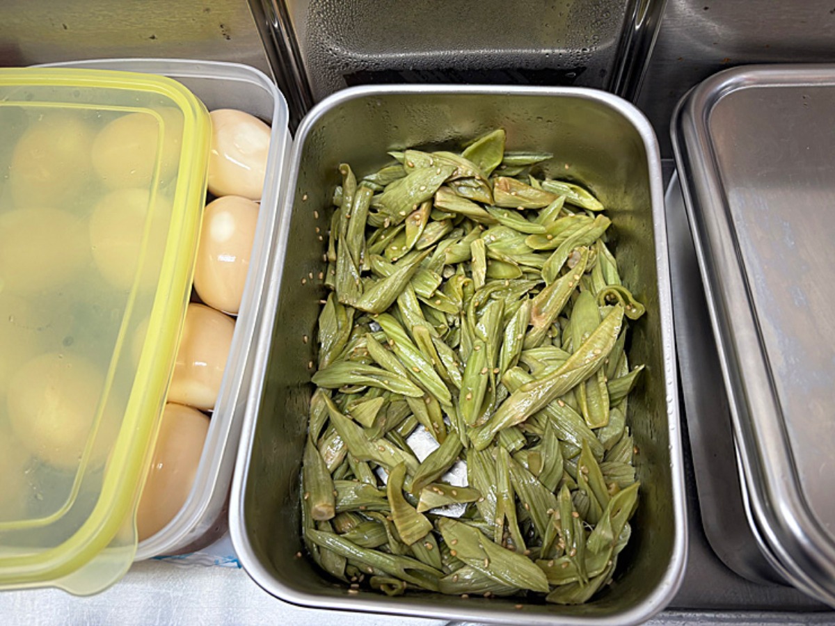 高山さんが久万高原町で初めて食べて衝撃を受けたと話していたイタドリです。調理された見た目は長ネギの青い部分のよう。こちらはメンマのかわりに添えられています。
