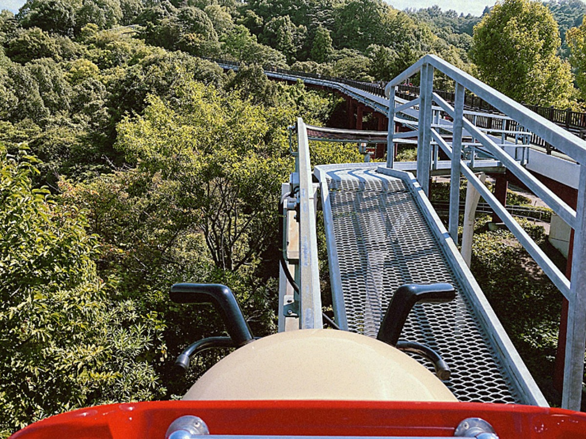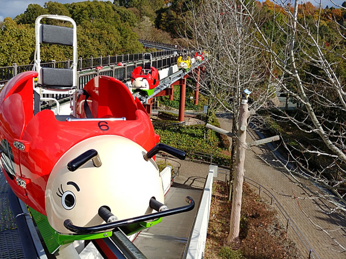 空中を走る「てんとう虫のモノレール」は、上りと下りがあり、400メートルほどの距離を約5分かけて移動する乗り物。高い位置からの景色に、子どもも大人もワクワクが止まりません。