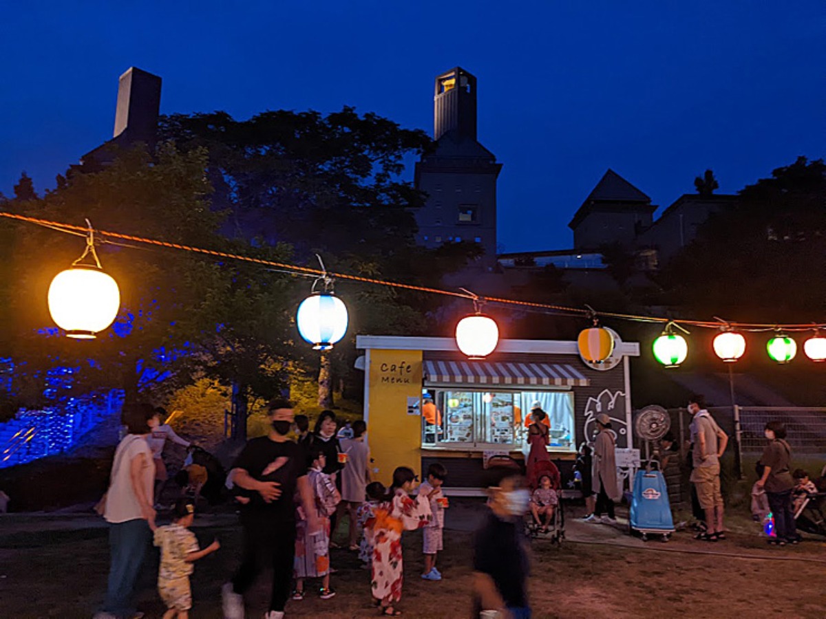 遊涼み会では、ふわふわドームのある芝生広場に、にぎやかな縁日気分を楽しめる屋台が登場!