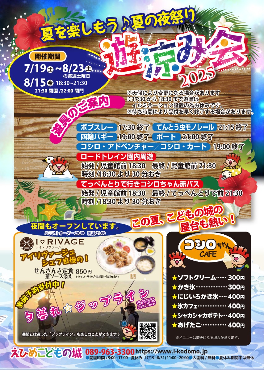 えひめこどもの城名物のジップラインが、「遊涼み会」期間中は夕暮れから夜にかけて特別運行します!