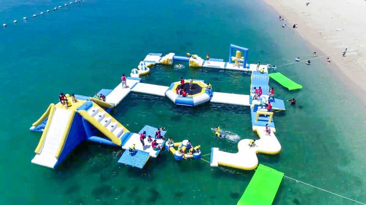 巨大なバルーンでできているアスレチックで、海の上に浮かんでいるので平坦な部分でもバランスを保つのが大変!