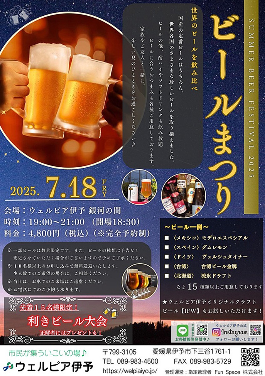 愛媛県伊予市にあるウェルピア伊予で、毎年多くのビールファンで賑わう「ウェルピア伊予 ビールまつり2025」が、2025年7月18日(金)に開催されます。