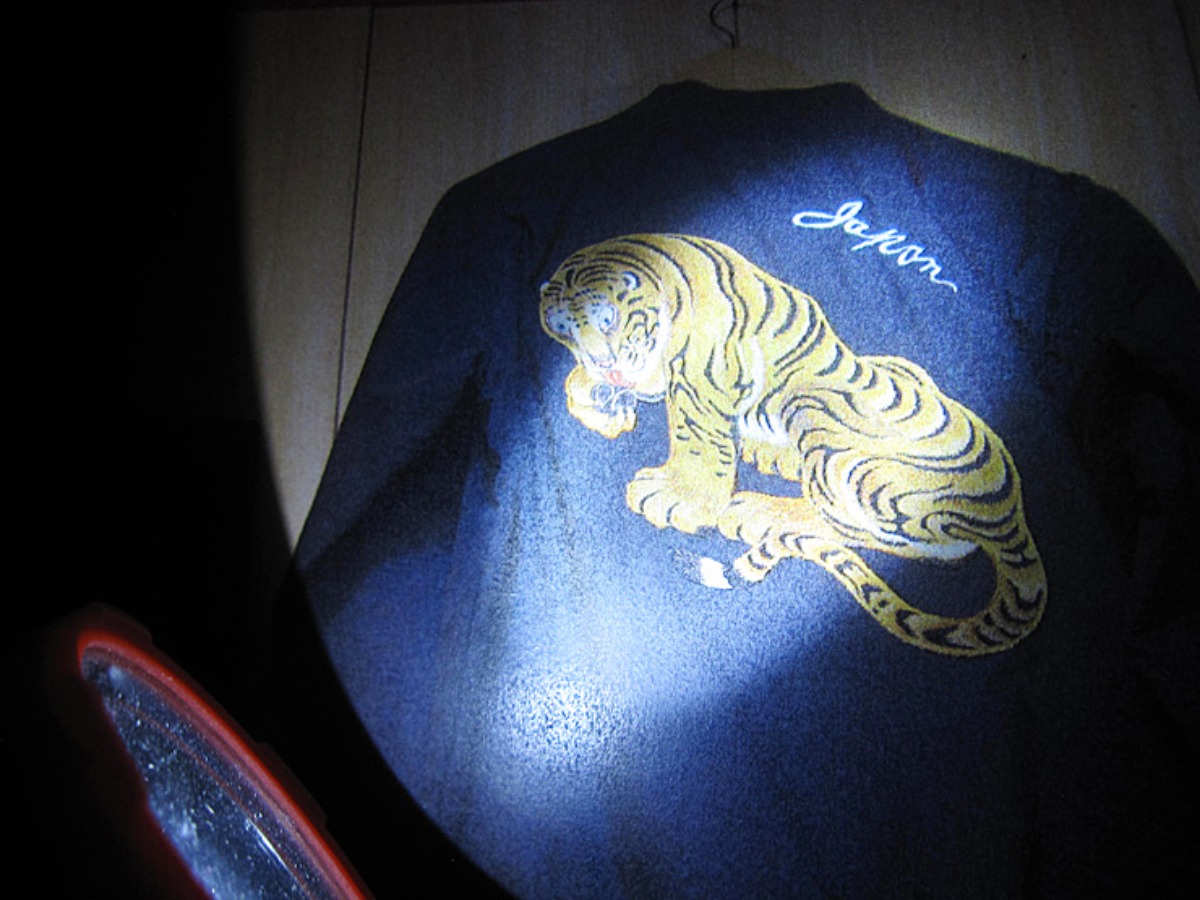 学芸員による案内のもと、懐中電灯を使って「現代日本画とアートな刺繍―縄文から現代へ―」を鑑賞。