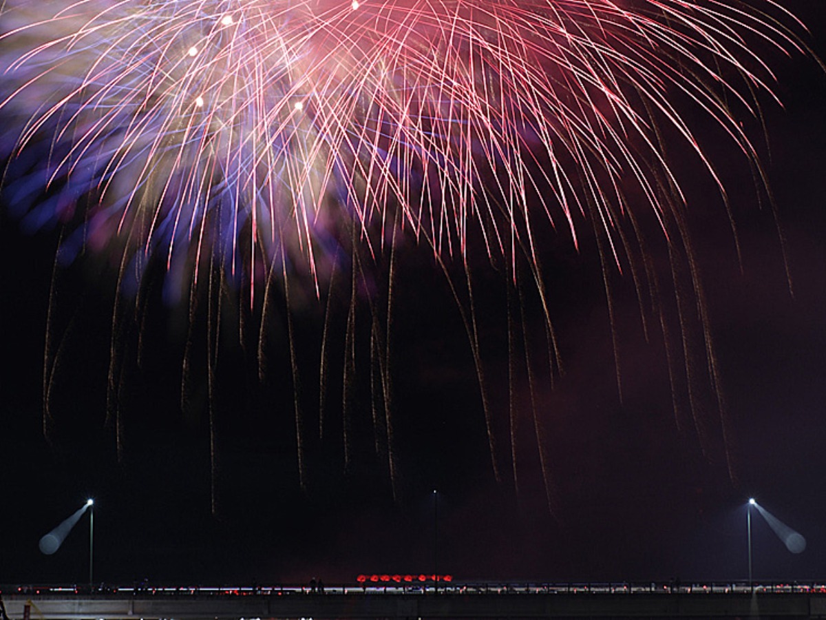 大門橋をはさんで3か所から一斉に打ち上げられる花火が、会場を取り囲むように夜空を染め上げます。