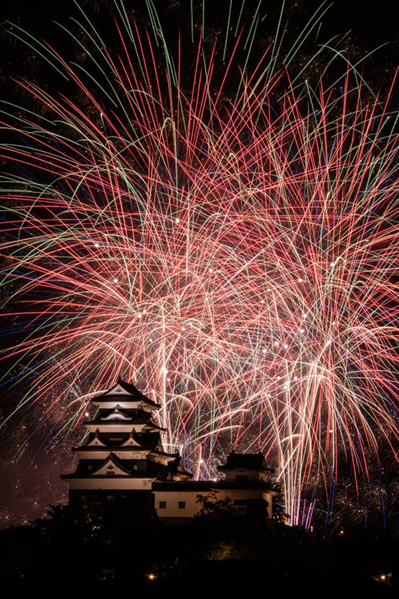 歴史ある天守と川面に広がる色鮮やかな花火が織りなす幻想的な風景は、まさに大洲ならではの絶景です。
