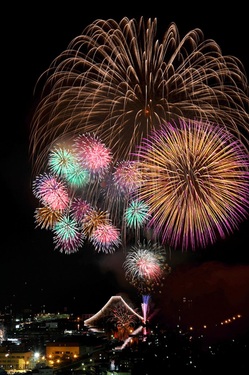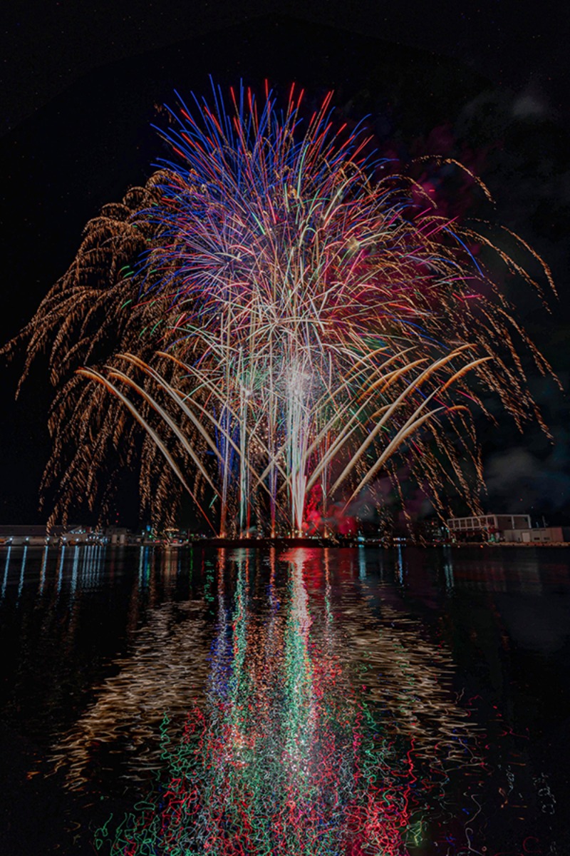 夜空に咲き誇る大輪の華と、海面に反射する光のコントラストが、幻想的な世界へと誘います。