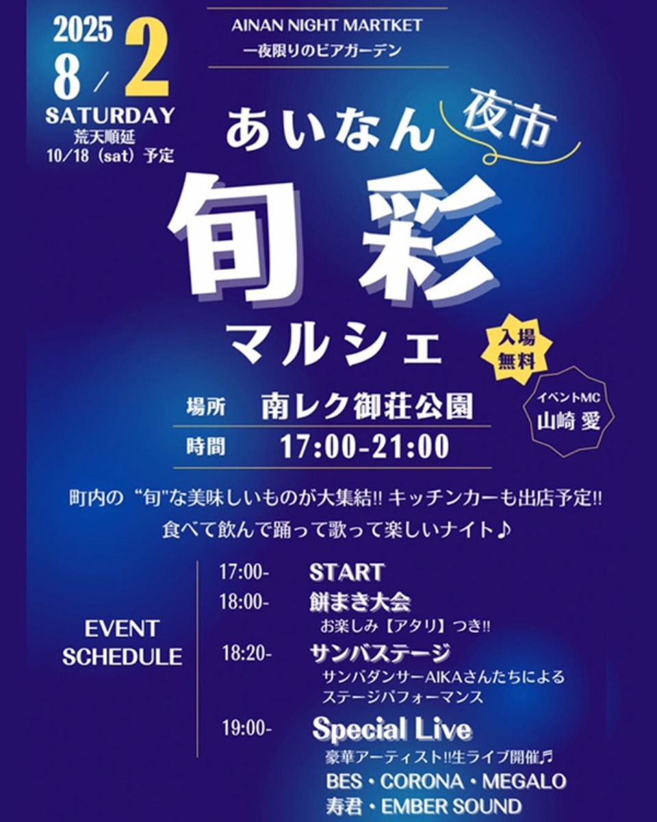 「あいなん旬彩マルシェ 土曜夜市」の開催は、2025年8月2日(土)17:00~21:00。