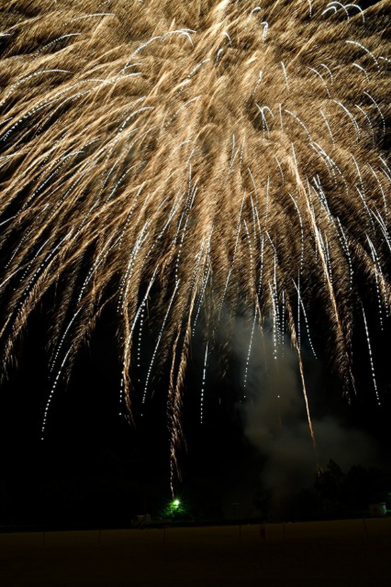玉川総合公園の広い空に打ち上がる花火は、頭上で大輪の花を咲かせるような迫力。