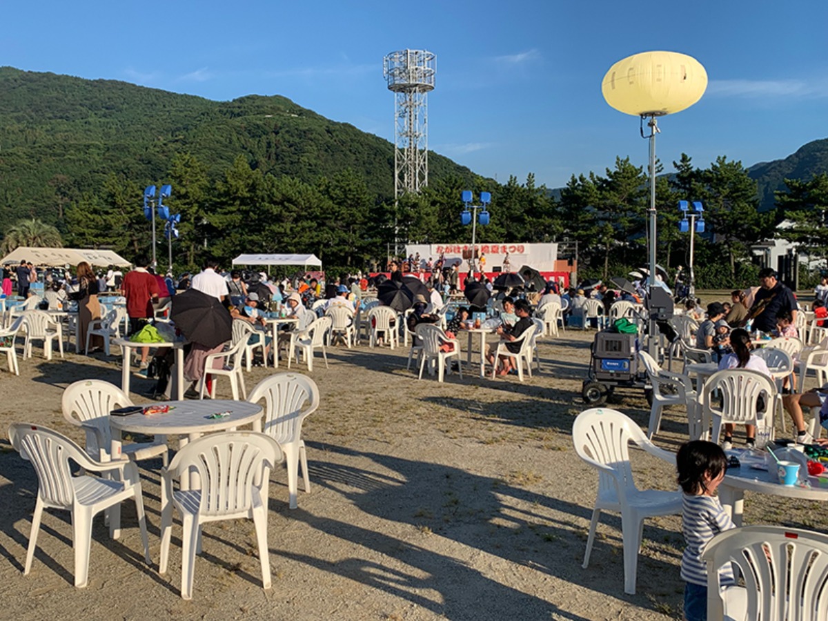 焼きそばやからあげ、串焼き、ポテトフライなどの定番メニューはもちろん、綿菓子やかき氷、そして地元特産の長浜産みかんジュースも楽しめるので、小さなお子さま連れでも安心。