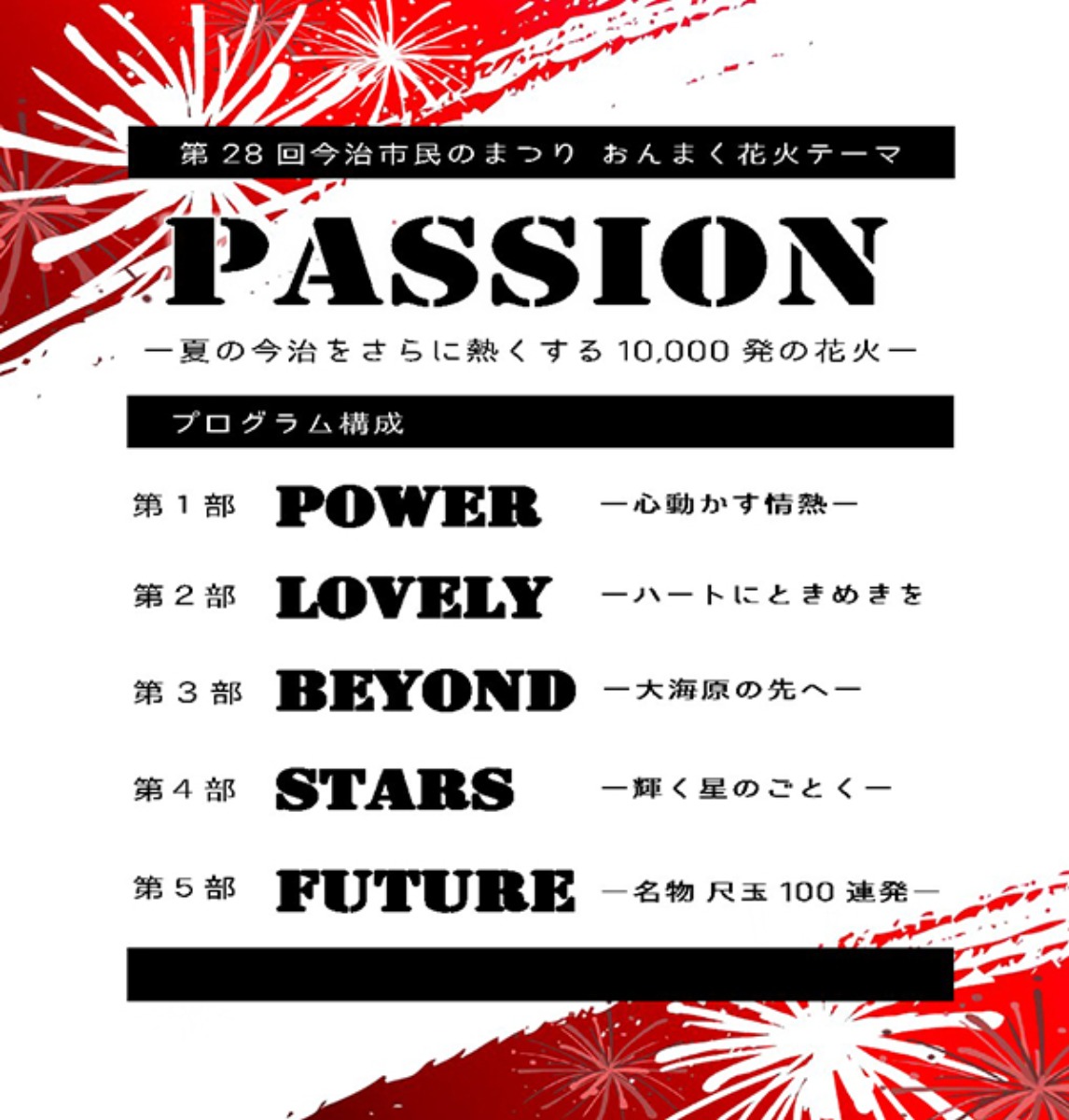今年のテーマ「PASSION ~情熱~」のもと、約1万発の花火が夜空を彩ります。