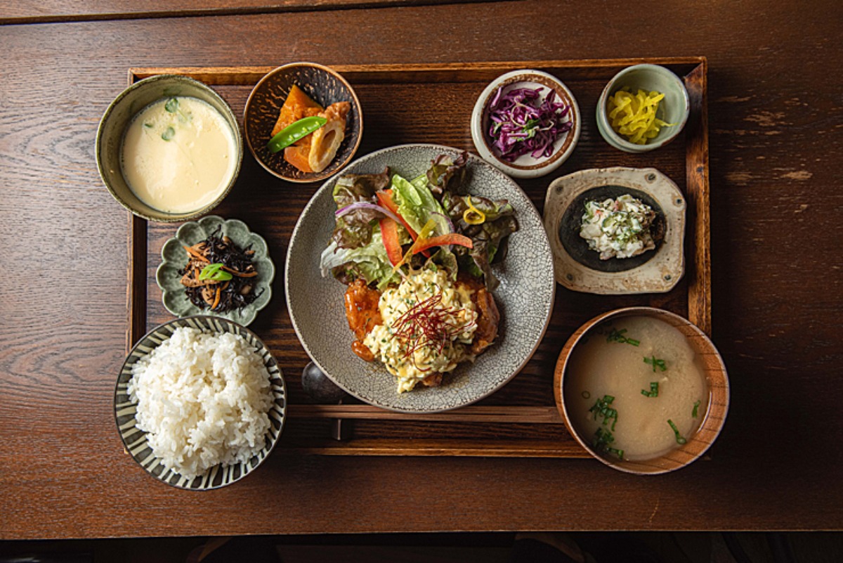 サラダや小鉢、味噌汁だけでなく、茶碗蒸しや選べるドリンクも付いた充実ランチ