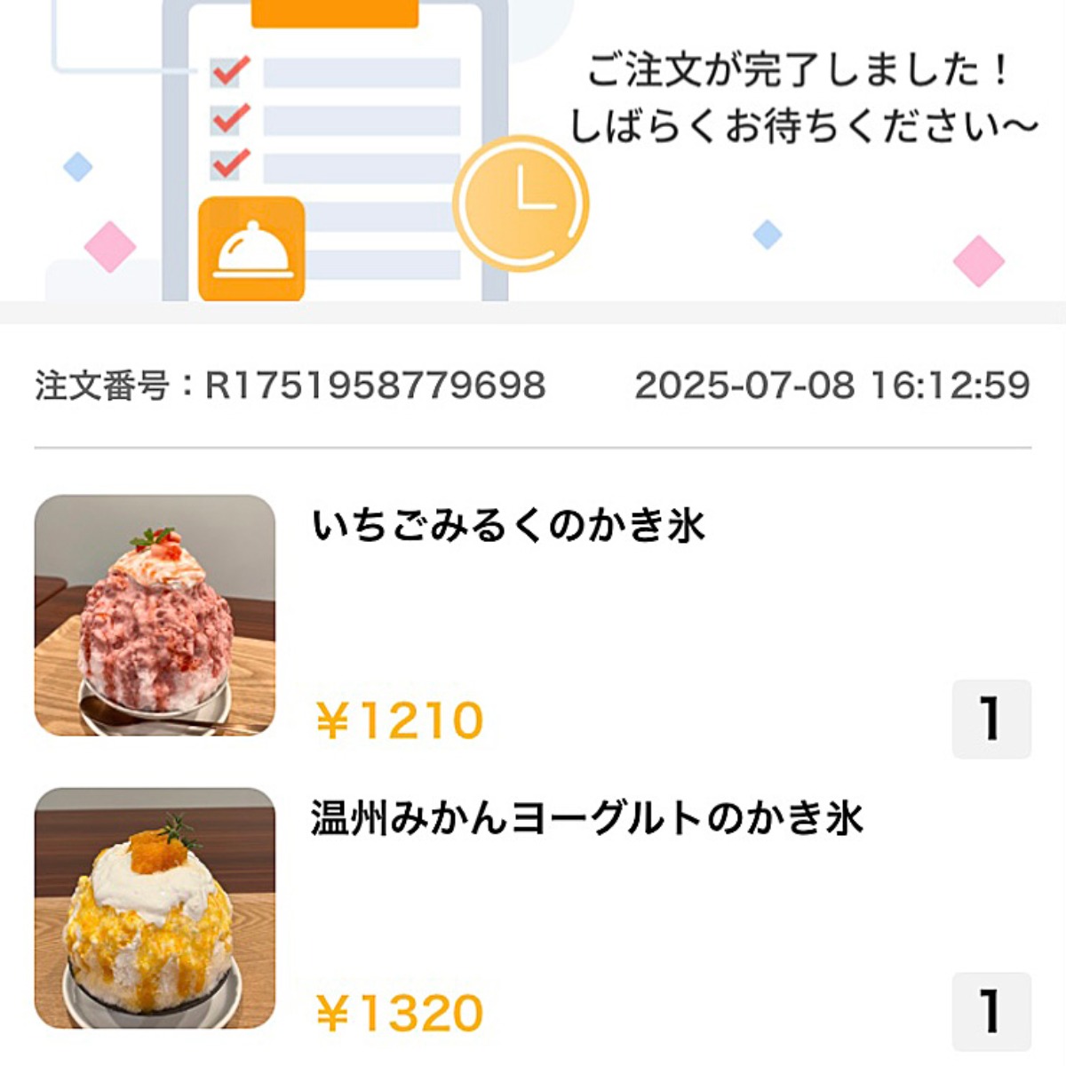 店内では、自分のスマホからメニューを注文します。2つのかき氷を注文!