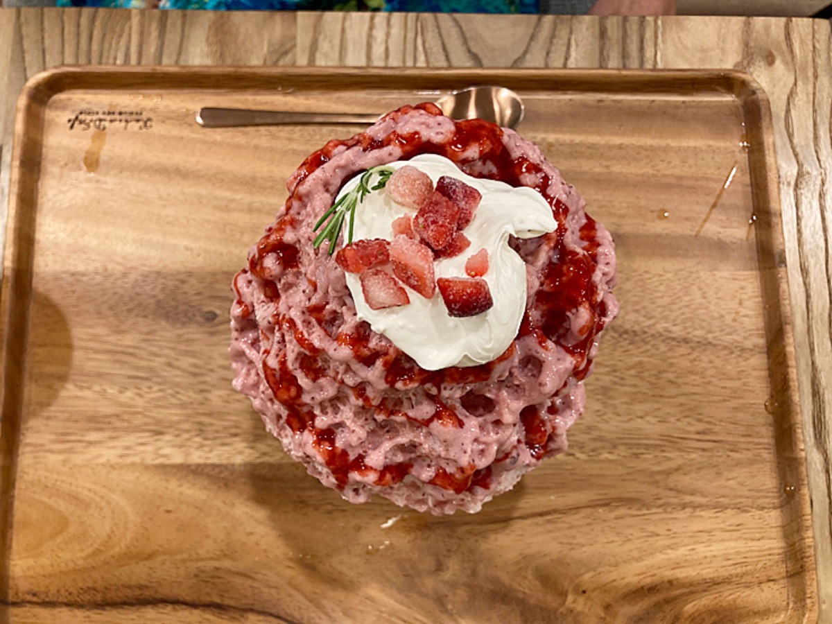 ふんわりと盛られたピンク色の氷に、白いクリームチーズが乗っかっていて、まるでスイーツのアート作品のようです。