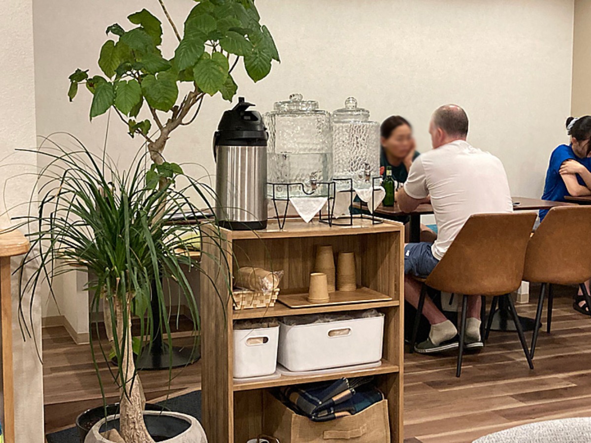 店内には水と温かいお茶のセルフコーナー。選べるのがありがたいですね。