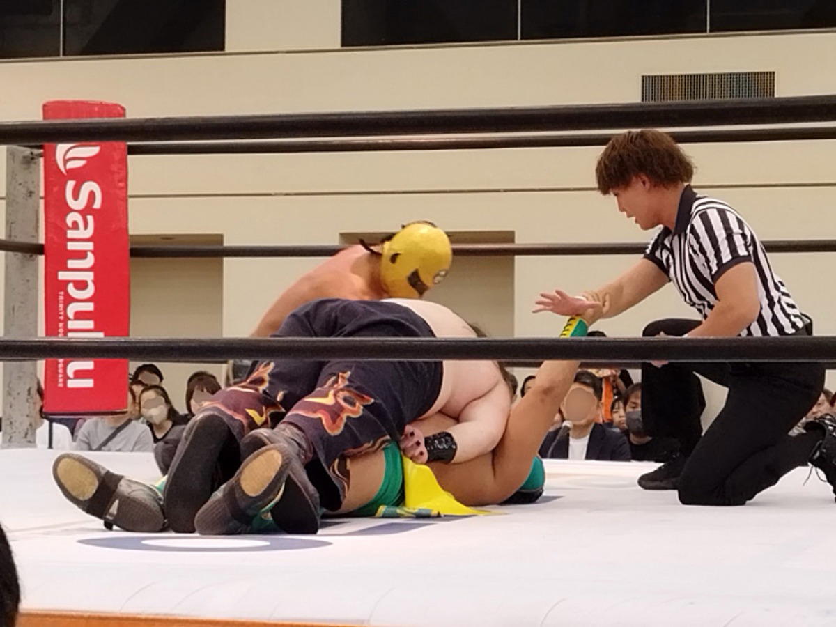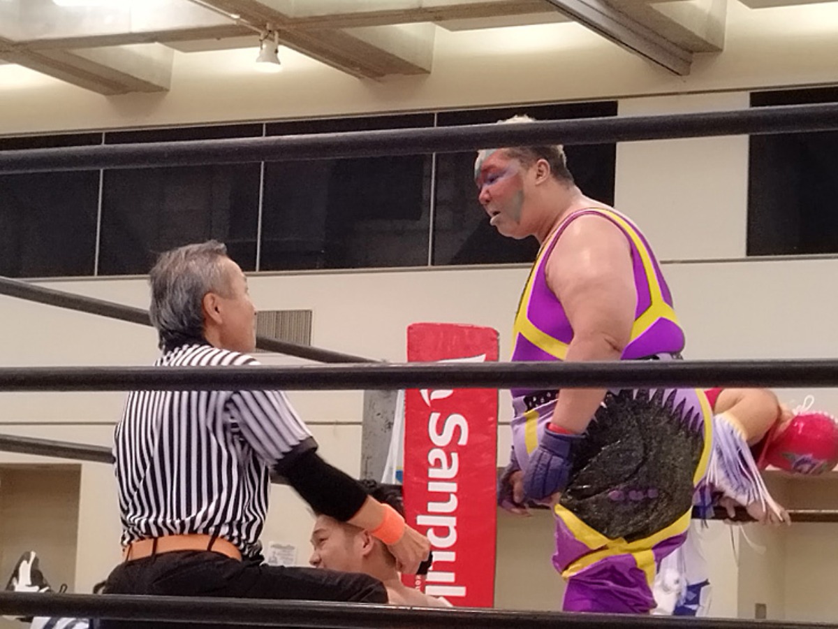 迎えたセミファイナル、愛媛プロレスの前に立ちはだかるのは、プロレス団体初のNPO法人「九州プロレス」からの刺客、身長170cmながら体重125kgを誇るパワーファイター野崎広大選手と、公式発表で身長1592mを誇る九州の大巨人、阿蘇山選手。さらには元お笑い芸人という異色の経歴を持つばってん×ぶらぶら選手という個性的過ぎるメンツ。パワーで魅せる野崎選手、阿蘇山選手に会場の観客を手玉にとるようなばってん×ぶらぶら選手のパフォーマンスも重なり、非常にスウィングした見応えのある攻防が展開。最後は野崎選手の大迫力のタックルがコマドリBOY選手に炸裂し3カウント。愛媛プロレスファンにとっては悔しい敗戦、リベンジに期待したいところ。