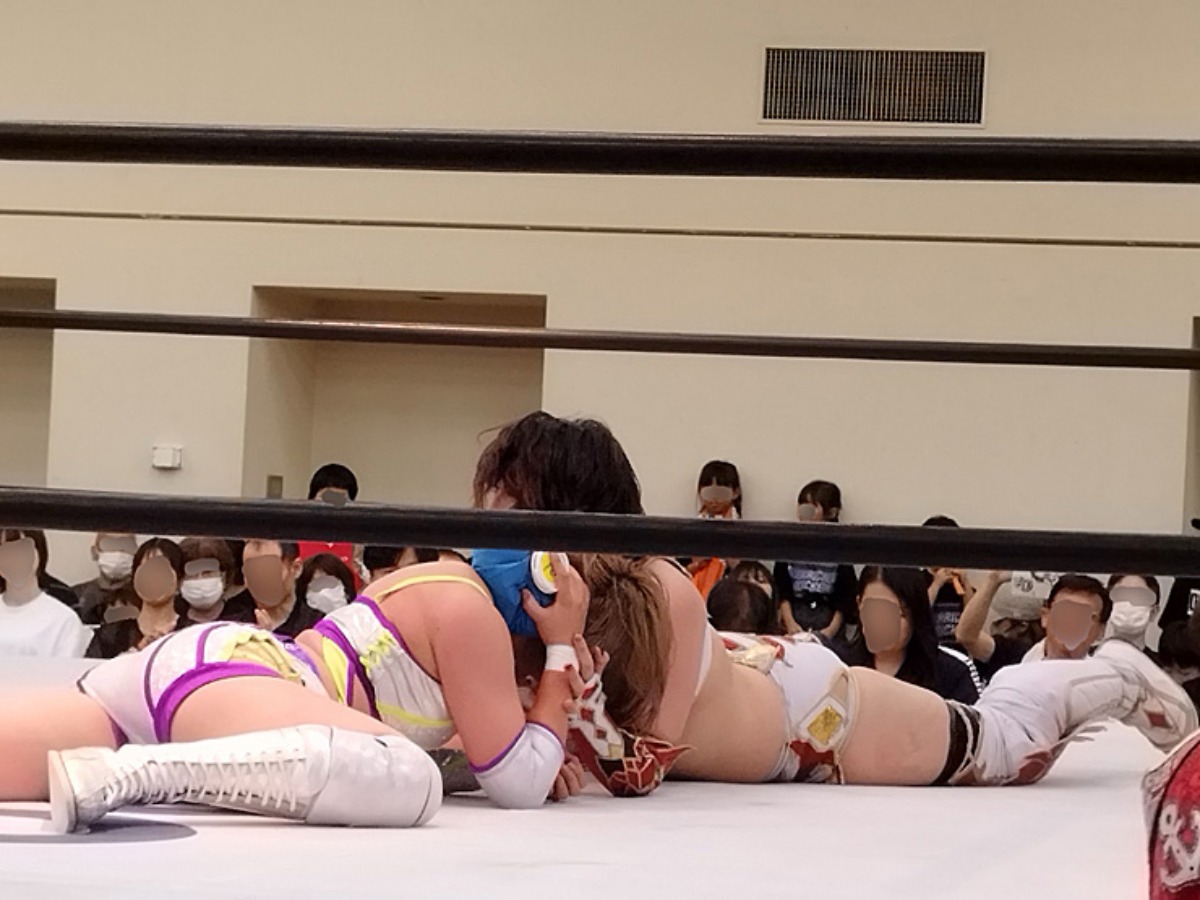 そして第4試合では愛媛プロレス唯一の女子選手、鶴姫花選手が女子プロレス界のトップ戦線に君臨する新興団体、マリーゴールド所属の林下詩美選手とシングルマッチ。強大な相手にも果敢に挑み、何度となく会場を沸かせる姫花選手、愛媛プロレスファンの声援を一身に背負って戦うも、やはり壁は分厚く、最後は詩美選手の高角度ジャーマンスープレックスで敗北。それでも未来に繋がる期待感をひしひしと感じる素晴らしい一戦でした!