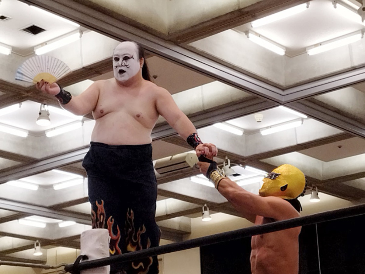 大衆プロレス松山座座長、松山勘十郎選手の手には扇子が。雅です。