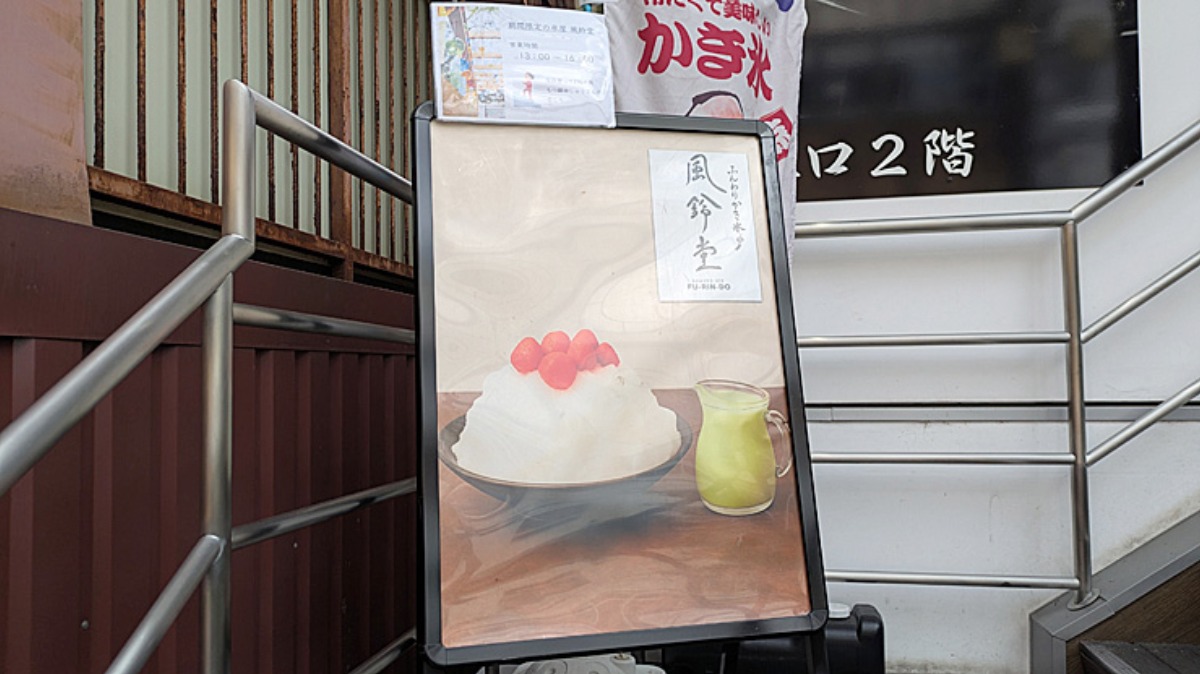 階段の途中に涼し気なかき氷の看板がありましたよ。