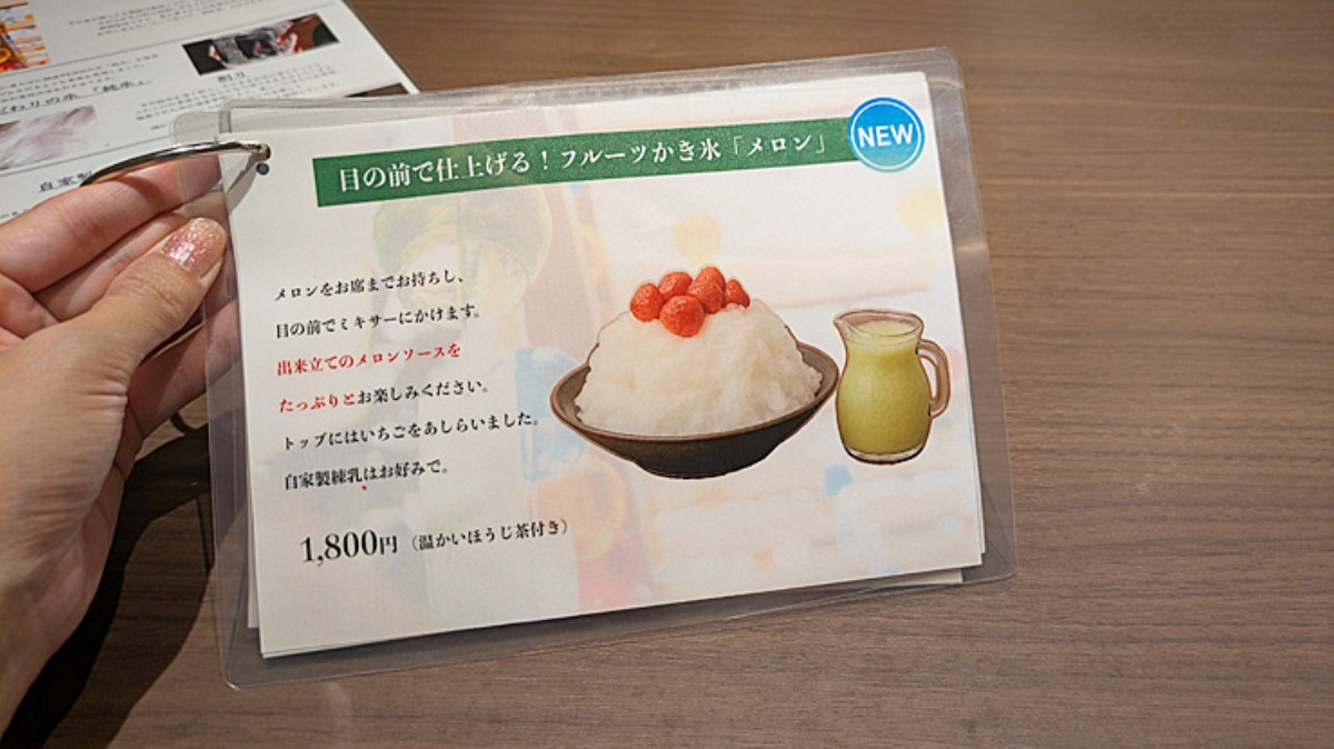 昨年食べてとても美味しかったきな粉キャラメルと迷ったんですけど、せっかくなら新メニューの「フルーツかき氷メロン」を今回は注文しました。