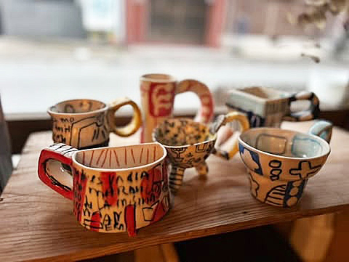 ラファエル・ナバスさんの絵画、イバタカツエさんの傘立てや箸置き、酒井薫さんのコーヒーカップなど、ひとつひとつのアイテムがアート作品のよう。