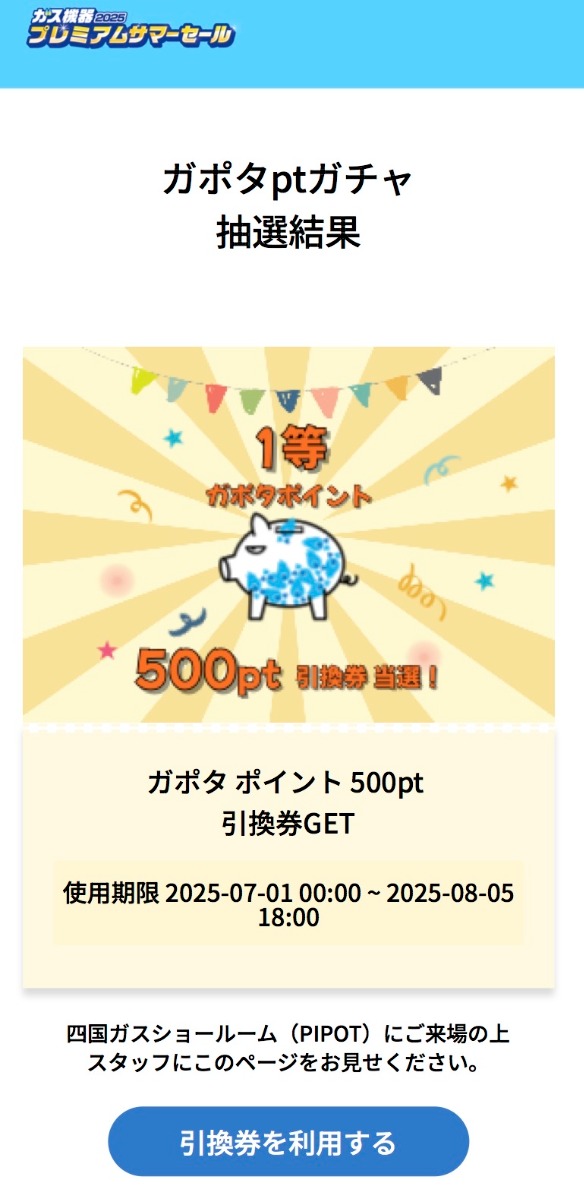 そんな便利な「ガポタ」ですが、プレミアムサマーセール期間中は、四国ガス(都市ガス)の契約者向けに「ガポタptガチャ」を実施中。