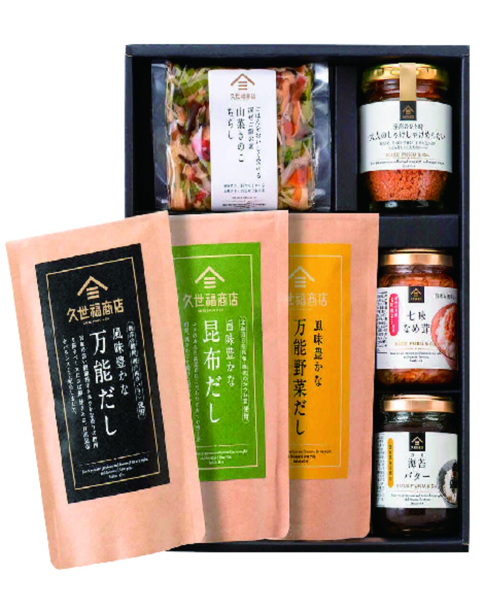 久世福商店で人気の万能だしやごはんのお供を詰め合わせた食卓が豊かになるセットです。