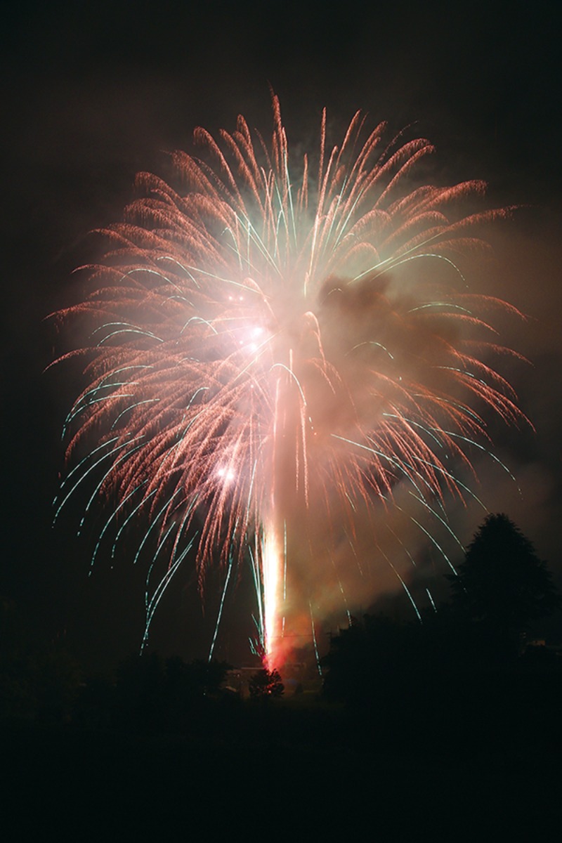 21:15頃から久万小学校付近で打ち上げが始まると、涼しい高原の空気と澄んだ夜空を背景に、鮮やかな光が広がります。