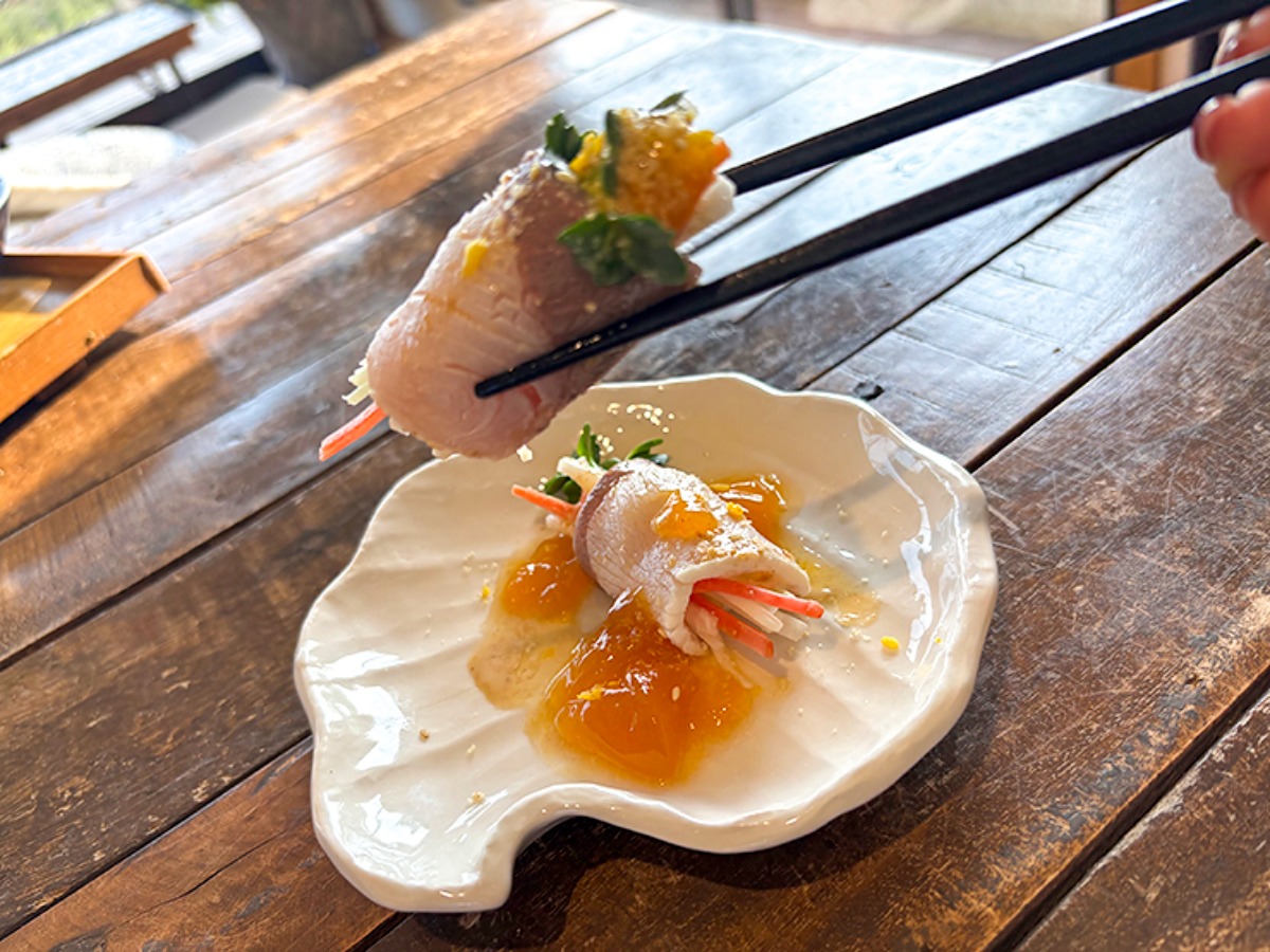 新鮮な瀬戸内の魚を使った「ブリの冷しゃぶ」には、大三島の特産「柑橘」を使ったジュレソース!