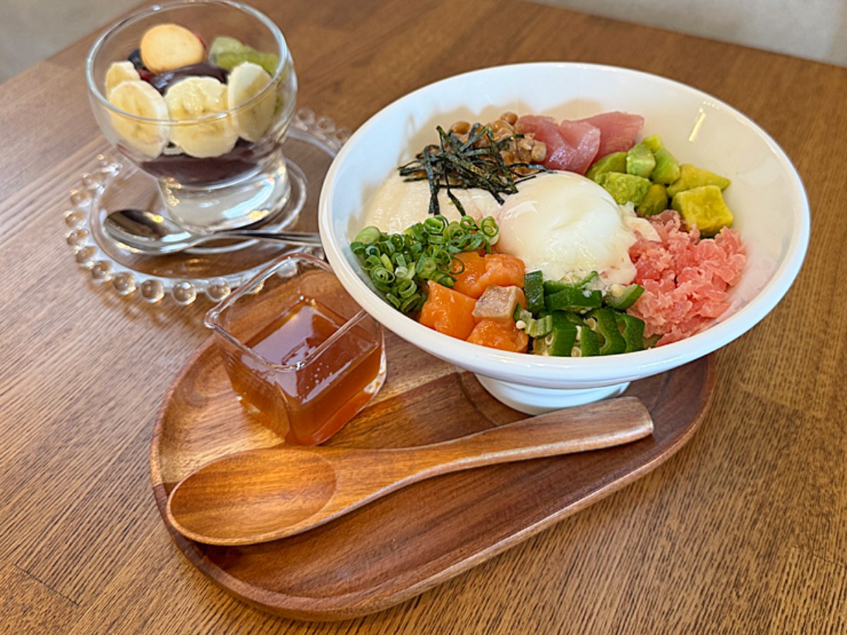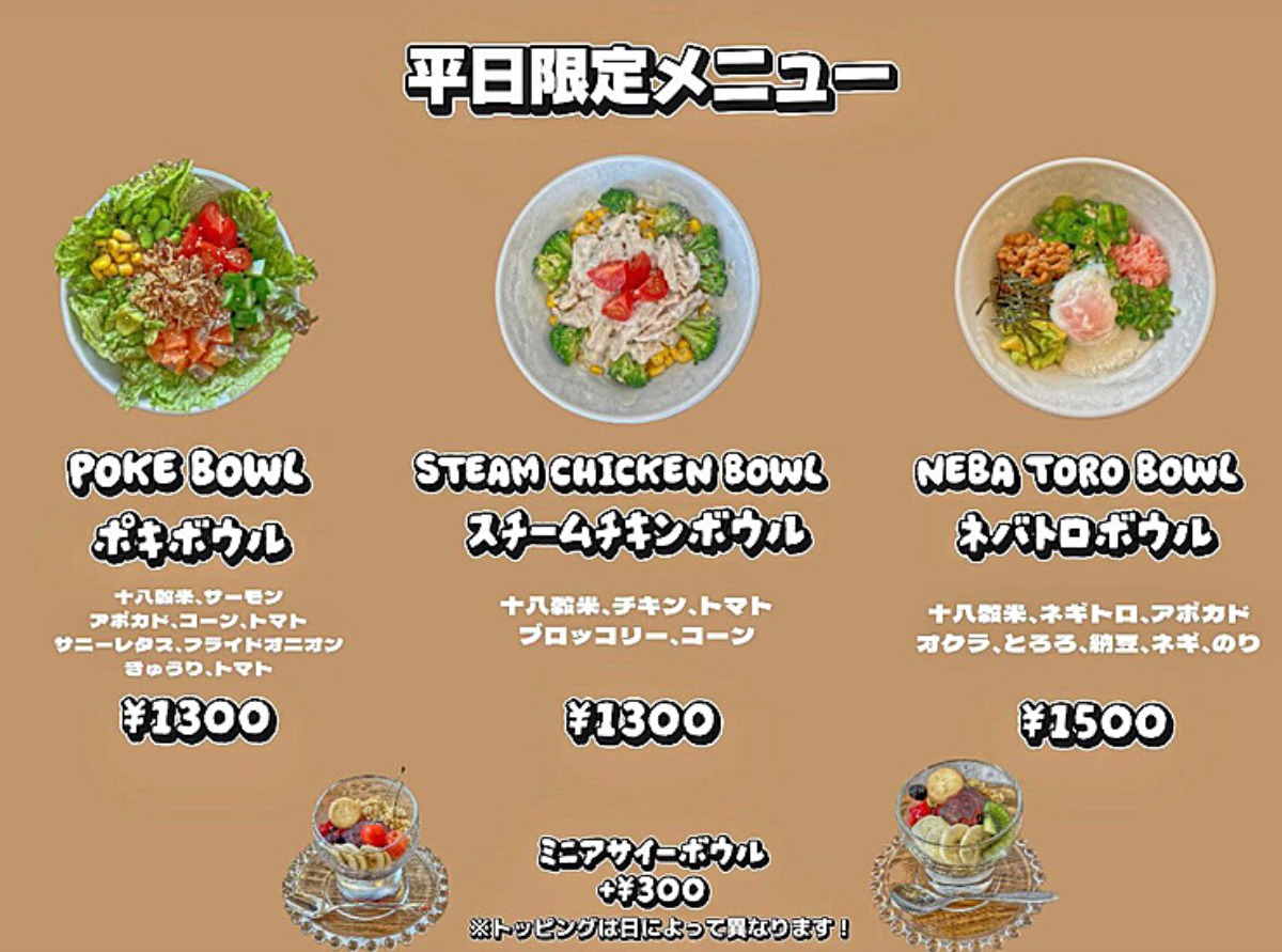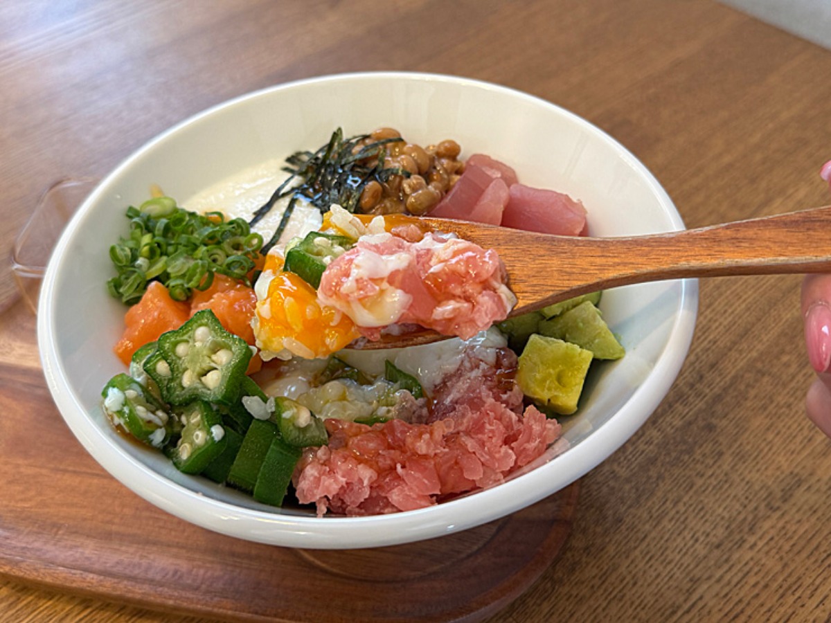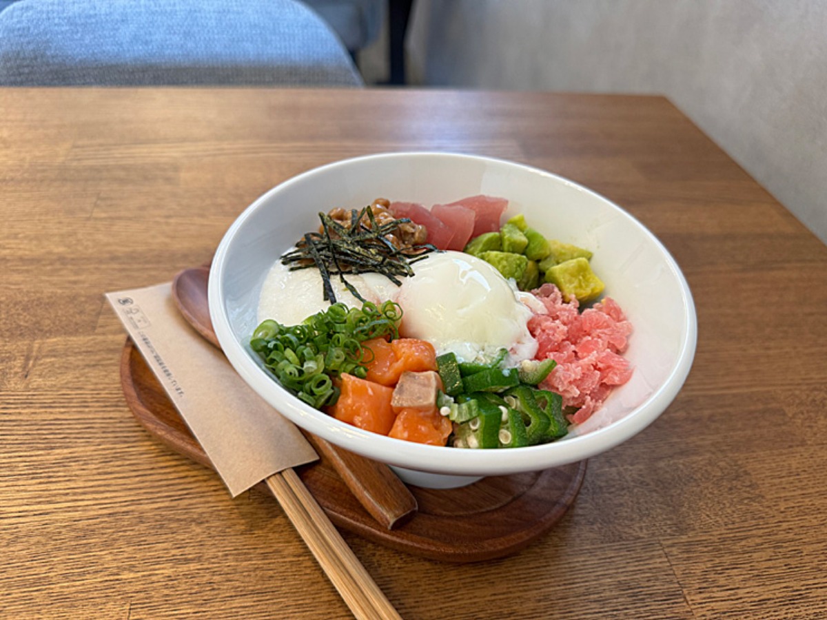 ランチメニューは、代表メニューのポキボウルを筆頭に、ヘルシーな食事がずらり♪「実は、夏にピッタリのスルッと食べられる新作ボウルを作ったんです。食べてみませんか?」夏にピッタリ……そう!ねばねば食材をギュッと盛り込んだ贅沢な一品です。