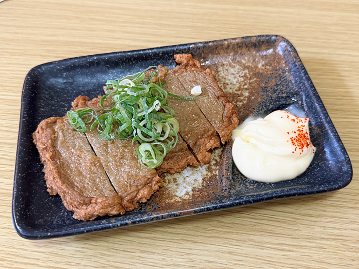 「湊定食」の魅力はまだまだ続きます♪愛媛と言えば、じゃこ天!しっかりと練り込まれた小魚の風味が口いっぱいに広がり、噛むほどに旨味がじわじわと…!シンプルだけどクセになる味わいで、海鮮丼や肉うどんに引けを取らない存在感です。