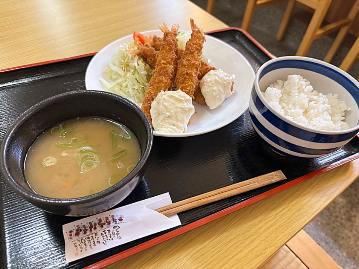 エビフライ定食はどど~んと大きいエビフライが4尾も!サクサクとした食感の衣を纏ったプリプリ食感の海老。タルタルソースをたっぷりつけて、いただきます♪お椀たっぷりに注がれたお味噌汁もごくっと♪人に作ってもらったお味噌汁はなぜこんなにも美味しいんでしょうか。ホッと心が休まります。