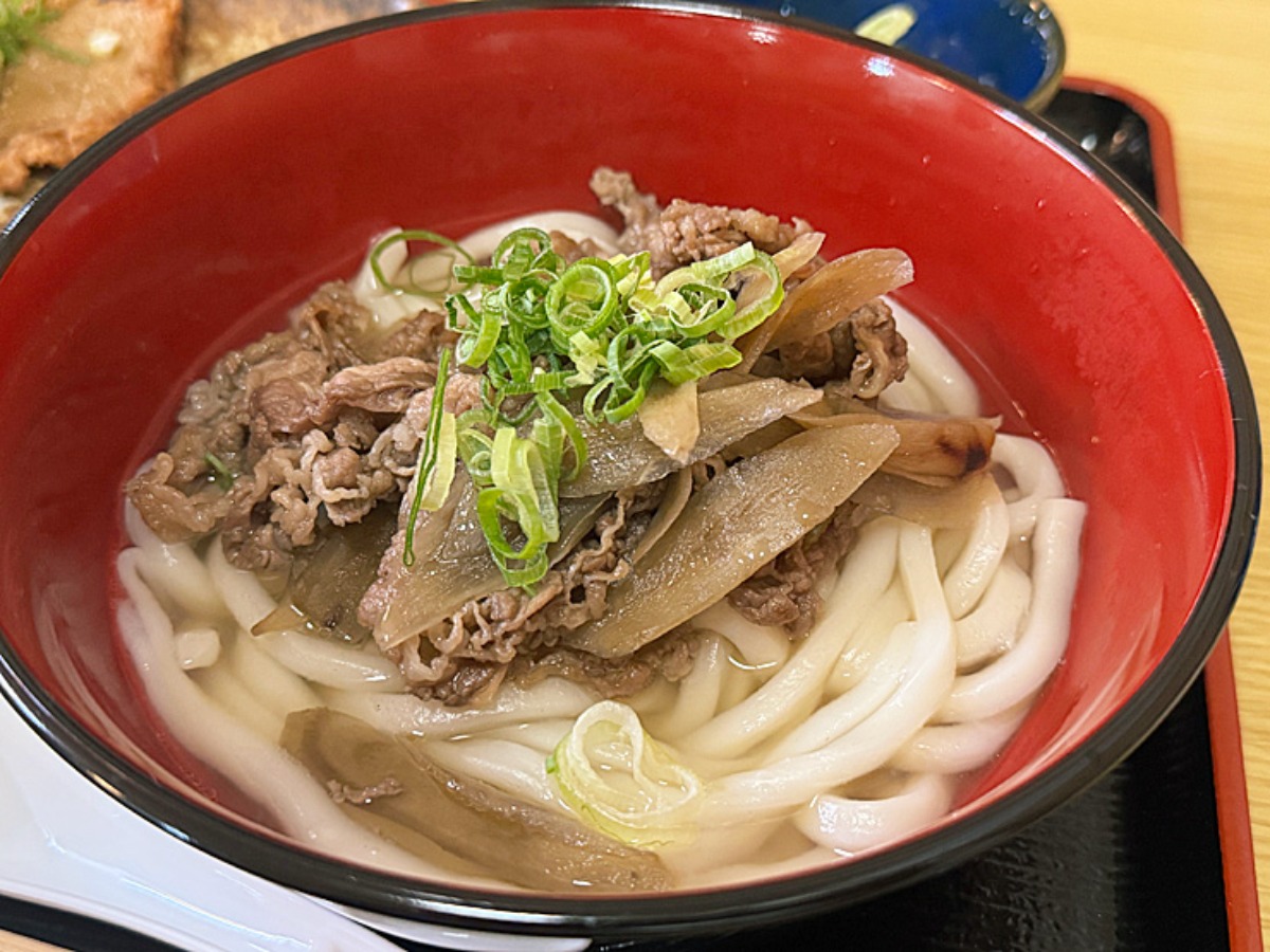 大きい器に盛られた肉うどん。湯気の立ちのぼるうどんと、しっかりと甘辛く煮込まれた牛ごぼうは、ひと口噛む度に旨味が染み渡り、まさに最高の一杯…!優しいお出汁の味に心も体もポカポカ温まります♪