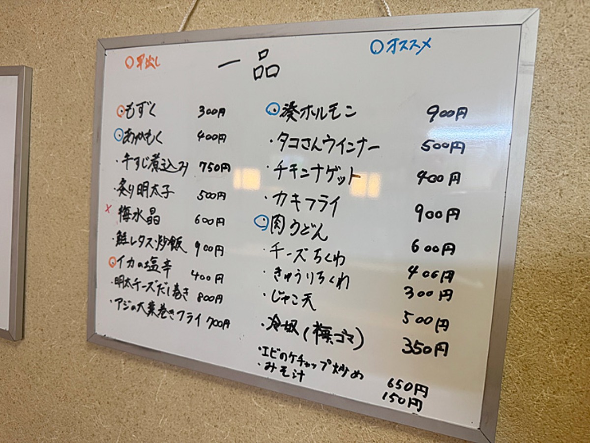 壁にかかっていた美味しそうな夜メニュー。写真のメニューはほんの一部で、魚料理からお肉料理まで多彩なメニューが用意されています。せっかくなので店主さんに、厳選!おすすめ3品を伺いました。からあげ・煮卵・湊ホルモンは絶対に食べてほしい逸品だそうです。迷わずこの3品は注文してくださいね♪