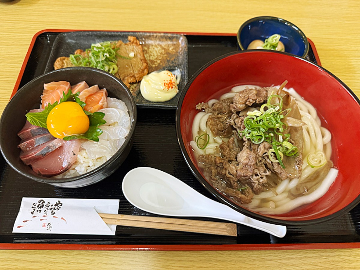 「湊定食」は、肉うどんと海鮮丼がメインとなった、魅惑の炭水化物×炭水化物ランチ。男性も大満足間違いなしのボリュームです。