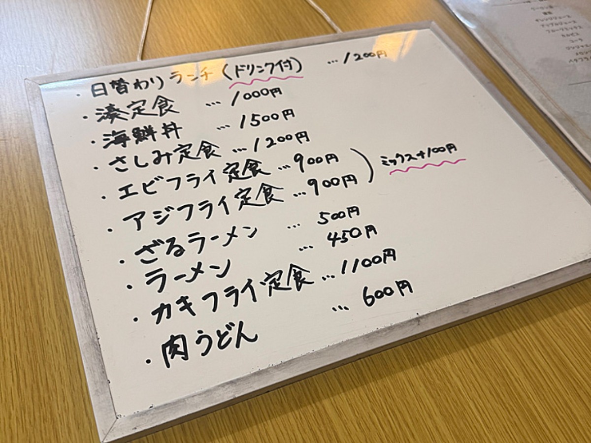 メニュー表を見ると、海鮮丼からエビフライ定食といった、居酒屋ならではの食欲そそる品々がずらりと並びます。老若男女どの層にも刺さる充実したランチメニューの中から、今回は、「湊定食」(1,000円)と「エビフライ定食」(900円)をいただきました。