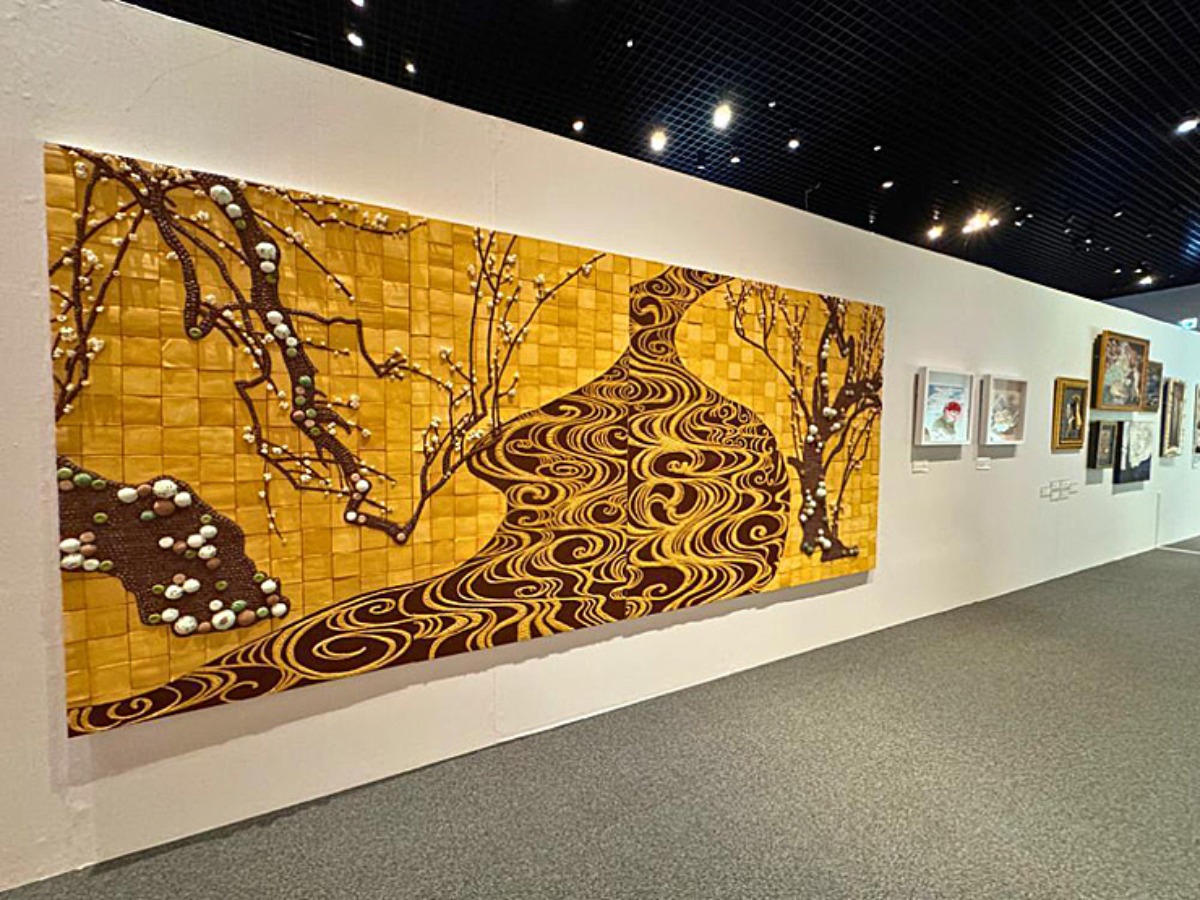 ひときわ大きな作品は江戸時代中期に描かれた、尾形光琳による「紅白梅図屏風」のオマージュで『Chocolate river』。