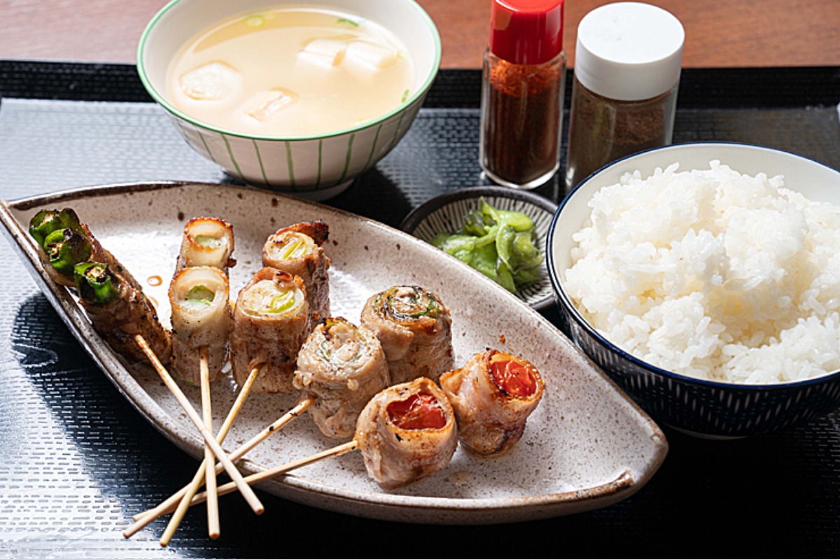 「魁」名物の串盛りランチは全3種。ご飯、味噌汁、漬物付きで1,000円。(お通し代不要)