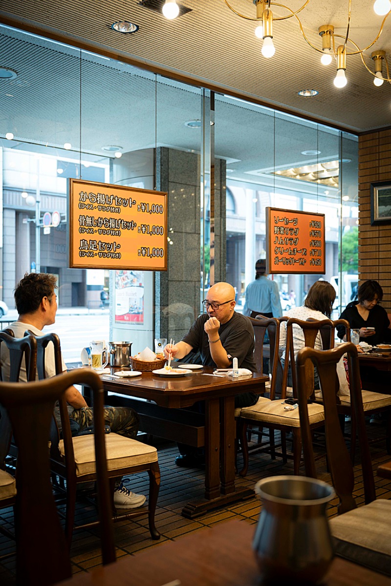 一番町通りに面した店内。常連が美味しそうに生ビールと唐揚げを楽しむ姿が印象的だ