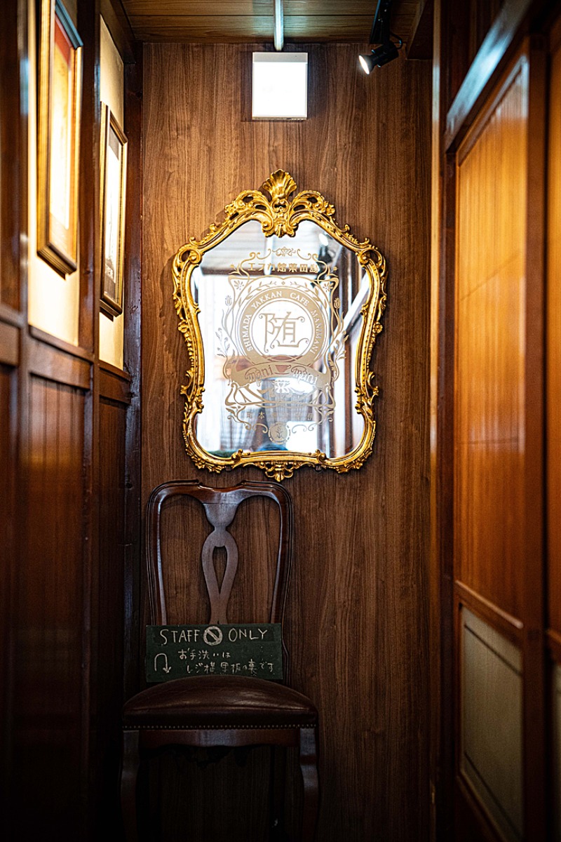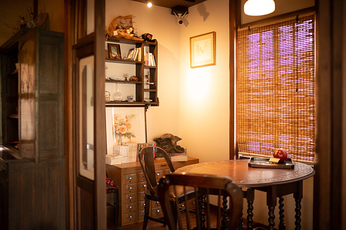 幼い頃から古いものに触れてきたという店主の収集した椅子や机、食器など一つひとつのアンティークと建物が出合い、より一層深い〝時の重なり〟を感じることができる空間となっている。